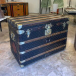 Toile enduite monogramme au pochoir, bordure lozinée marron, coins, poignée et serrures en laiton, 2 chassis dont un avec compartiments.